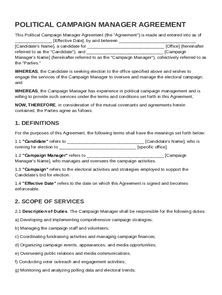 A Political Campaign Manager Contract Template is a legal document that outlines the terms of engagement between a campaign manager and a political candidate or organization.