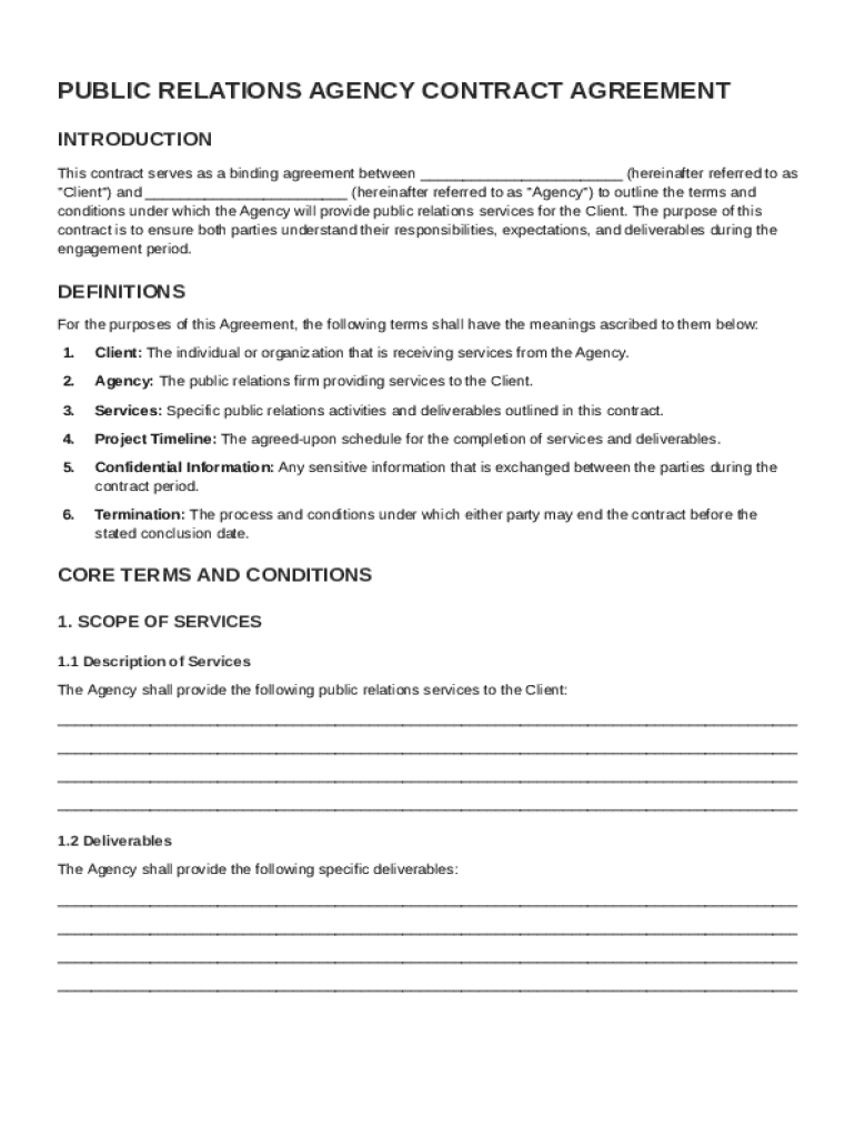 This contract outlines the terms and conditions under which a public relations agency provides services to a client, including definitions, responsibilities, compensation, confidentiality, intellectual