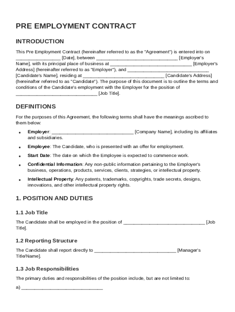 A Pre Employment Contract Template is a legal document outlining the terms of employment between an employer and a prospective employee before formal hiring.