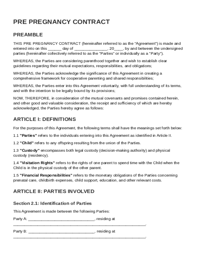 This guide explains how to effectively fill out a Pre Pregnancy Contract Template form using pdfFiller. Such a contract helps to ensure clarity in parental roles and obligations during pregnancy.