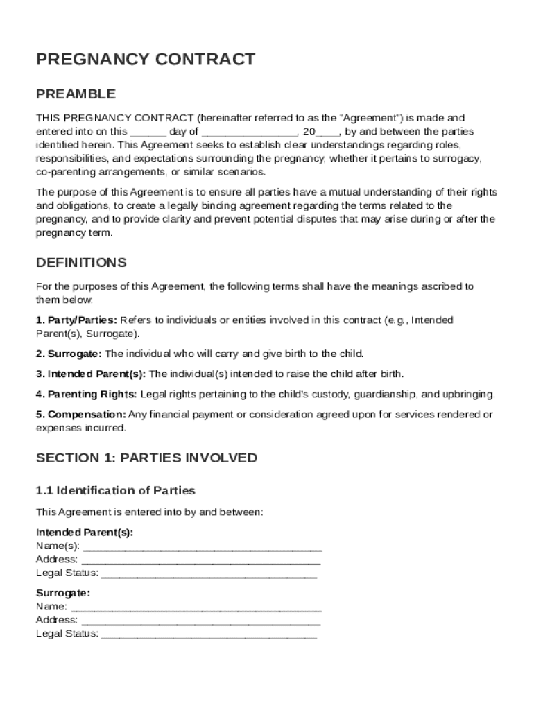 The core components of a pregnancy contract typically include clear definitions of the parties involved, outlined parenting rights, and the compensation structure. These elements are essential for the smooth operation of the agreement.