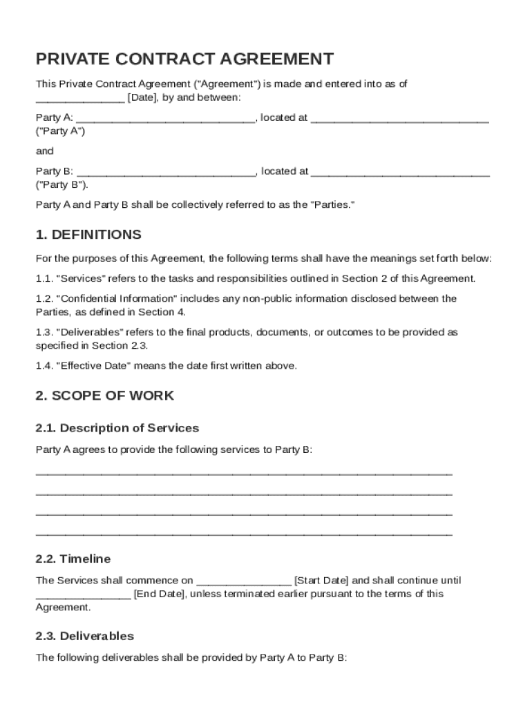A private contract agreement is a formal arrangement between two or more parties that outlines the terms and conditions for a specified exchange. These contracts are essential for establishing clear expectations and responsibilities, protecting the rights of all parties involved, and minimizing the risk of disputes.