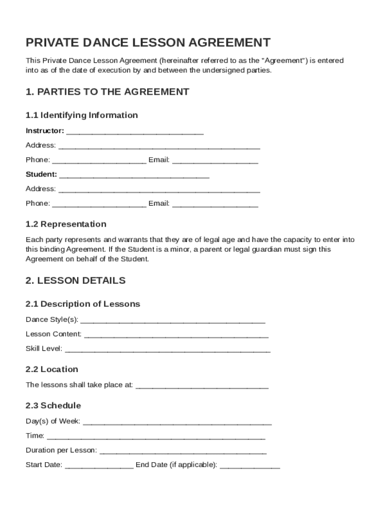 Main sections and clauses of a Private Dance Lesson Contract Template