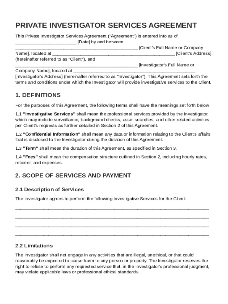 A Private Investigator Services Agreement is a formal contract that outlines the relationship between a client seeking investigative services and the investigator who will perform those services. This agreement is crucial for establishing clear expectations, responsibilities, and scope of work.