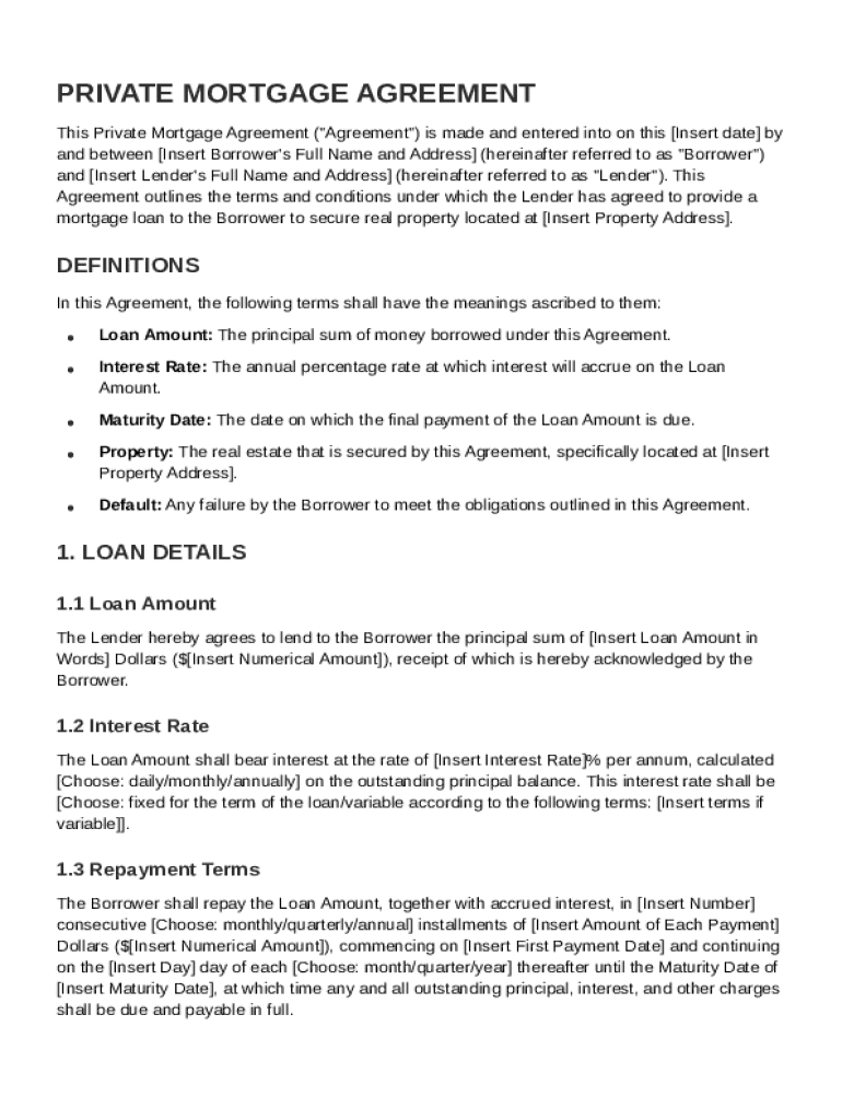 A well-structured Private Mortgage Agreement covers essential details to safeguard both parties. Understanding terms such as Loan Amount, Interest Rate, and Maturity Date is vital to managing expectations. Furthermore, identifying the property secured by the loan protects the lender's interests, while clearly defined default conditions outline consequences for non-payment.