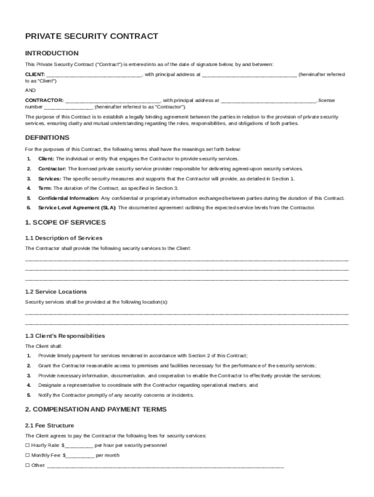 A Private Security Contract is a legally binding agreement between a client and a security contractor that outlines the scope, terms, and conditions under which security services will be rendered. These contracts are crucial for ensuring that both parties understand their rights and responsibilities, helping to mitigate potential disputes.