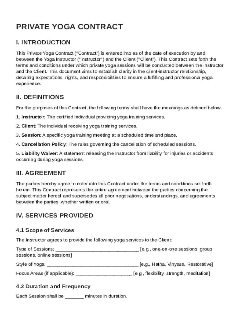 A private yoga contract is a formal agreement between a yoga instructor and their clients that outlines the terms and conditions of the yoga sessions. It serves to clarify responsibilities, protect both parties legally, and ensure that expectations are met. Having a private yoga contract template is essential for establishing trust and professionalism in your yoga practice.