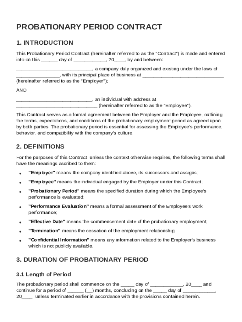 This document serves as a formal agreement between the Employer and the Employee outlining the terms, expectations, and conditions of the probationary employment period. It details responsibilities,
