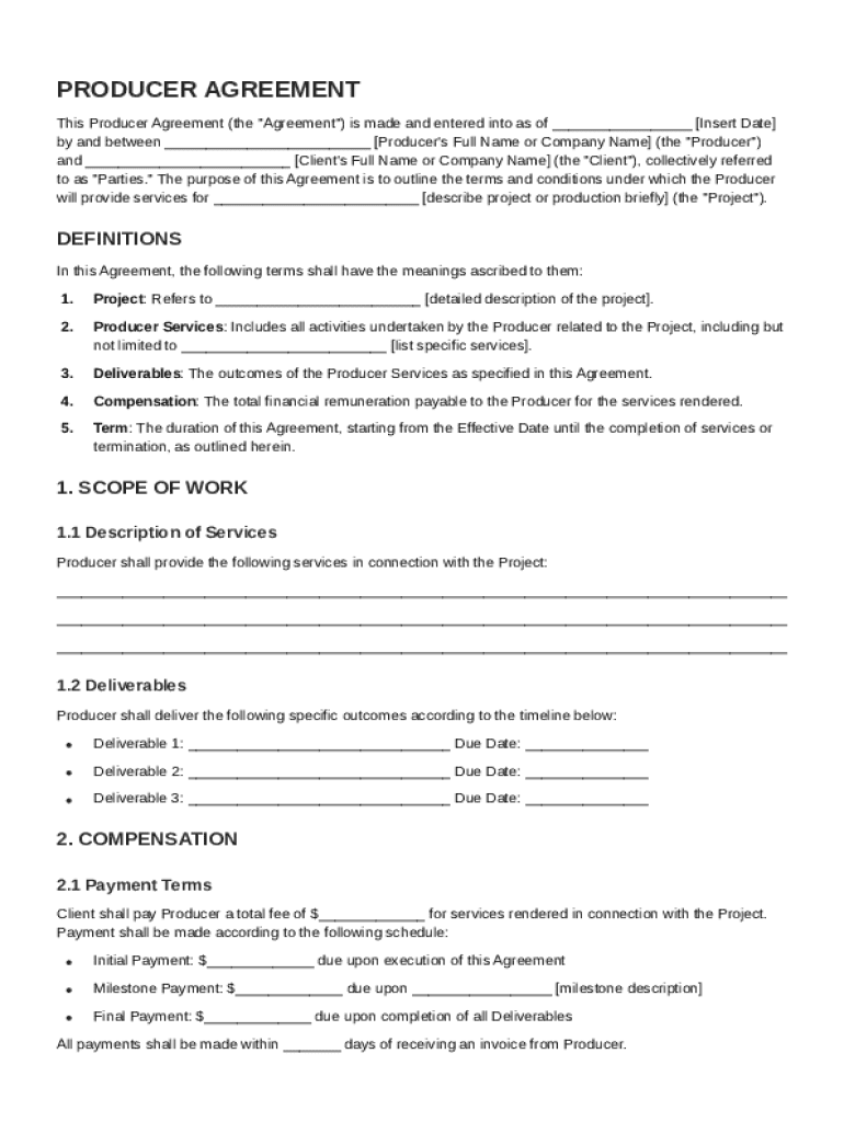 A comprehensive Producer Agreement includes several critical sections to ensure clarity and legal protection.