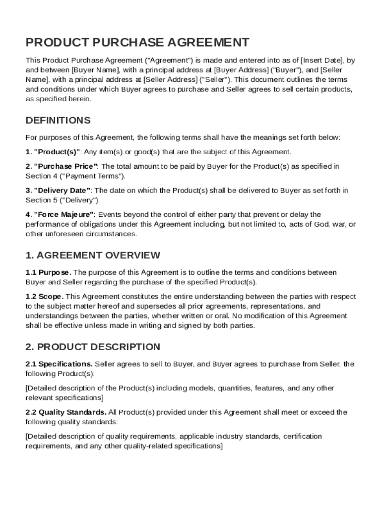A Product Purchase Contract Template is a legal document outlining the terms and conditions of a sale between a buyer and a seller for specified goods.