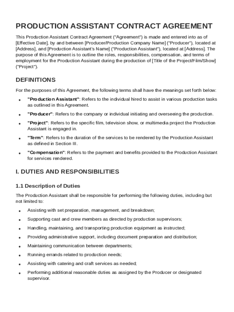 Defining key terms is essential for clarity in any contract. For a Production Assistant, this involves demarcating roles, responsibilities, and the expected duration of work.
