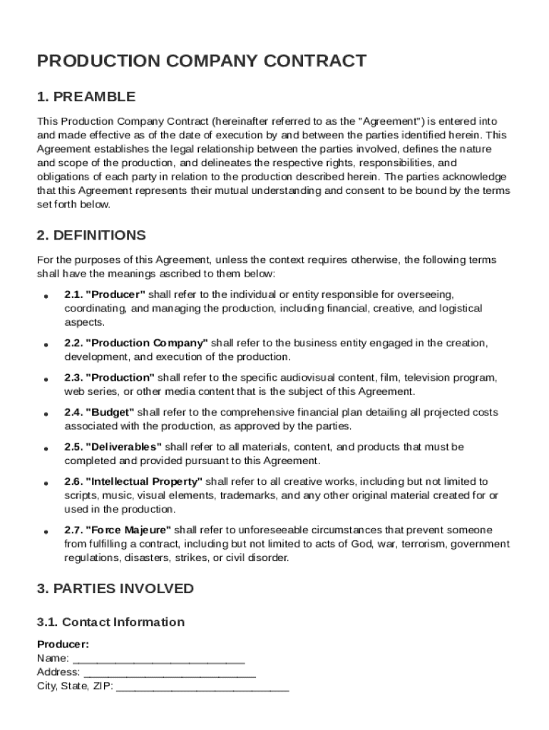 A Production Company Contract Template is a legal document that outlines the terms and conditions between a production company and its clients or partners for media production services.