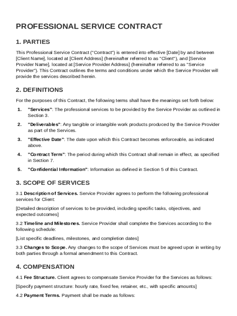 Understanding the major elements of a professional service contract is essential for effective contract management. Each component plays a role in ensuring clarity and legal enforceability.
