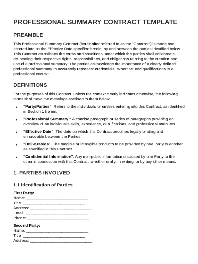 A Professional Summary Contract is a document summarizing a professional's skills, experience, and objectives, serving as a framework for agreements. Its importance lies in providing a concise overview that enhances understanding between parties, making it essential in both job applications and contractual agreements.