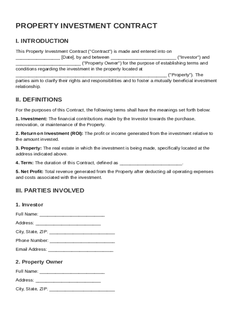 A Property Investment Contract Template is a legal document that outlines the terms and conditions of a real estate investment agreement between parties.