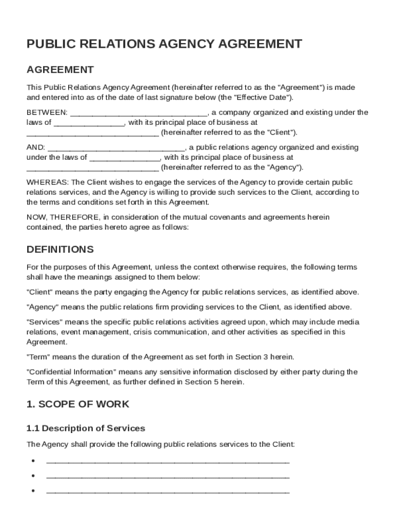 This document outlines the agreement between a Client and a Public Relations Agency regarding the provision of public relations services, including definitions of terms, scope of work, compensation,