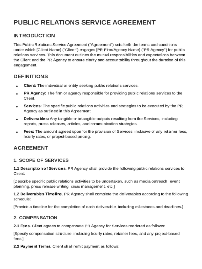 Key terms like Client, PR Agency, Services, Deliverables, and Fees should be clearly defined.