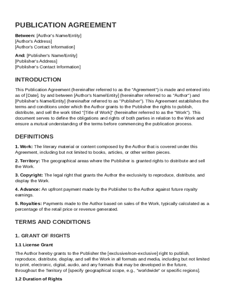 A Publication Agreement defines the relationship between the author and the publisher regarding the distribution of literary content. This contract serves to protect the rights of authors, ensuring that the terms of publication are clear, transparent, and agreed upon before any work is published.