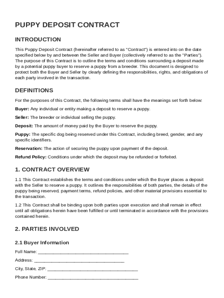 Understanding essential terms in the Puppy Deposit Contract is crucial for both buyers and sellers. Knowing these terms can help avoid misunderstandings and ensure a smoother transaction.