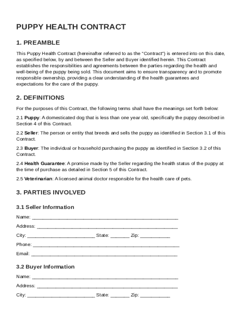 A puppy health contract is a legal document that outlines the health responsibilities of both the seller and buyer of a puppy. This contract is essential for ensuring both parties understand their rights and obligations regarding the puppy's health conditions, guarantees, and disclosures.