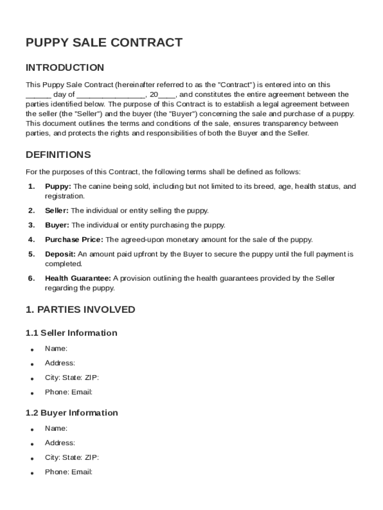 This document establishes a legal agreement for the sale and purchase of a puppy, outlining terms, conditions, responsibilities, and health guarantees between the seller and the buyer.