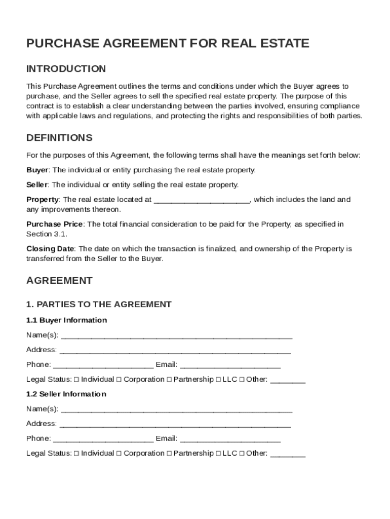This Purchase Agreement outlines the terms and conditions under which the Buyer agrees to purchase, and the Seller agrees to sell a specified real estate property, ensuring compliance with laws and