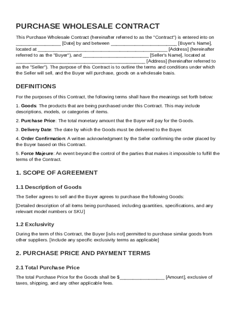 A Purchase Wholesale Contract is a legal agreement between a buyer and a seller to outline the sale of goods at wholesale prices. Its purpose is to clearly define the relationship and responsibilities of both parties. Clarity in terms and conditions is essential to avoid disputes.
