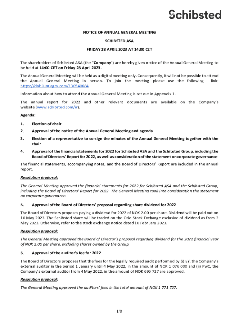 This document serves as a notice to shareholders regarding the Annual General Meeting of Schibsted ASA, including details on the agenda, voting procedures, and how to participate in the meeting.