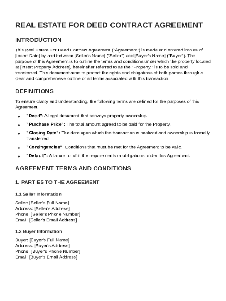 A Real Estate For Deed Contract Template is a legal document that allows for the transfer of property ownership while detailing the terms and conditions of the sale.
