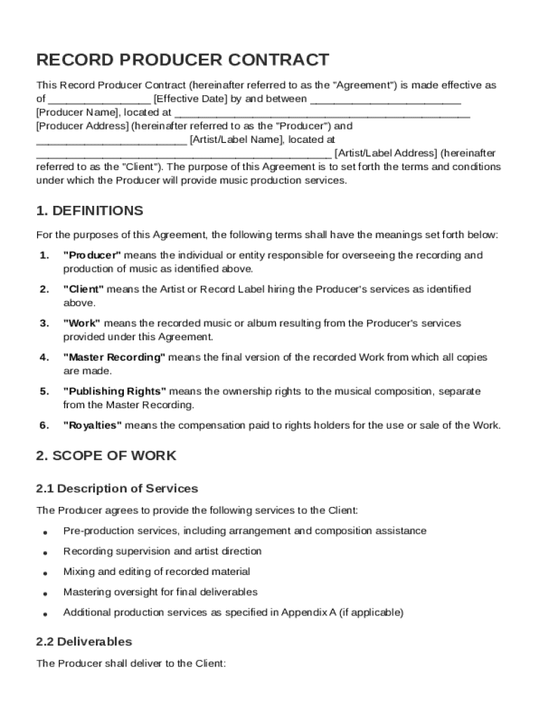 Creating a record producer contract template form is essential for establishing clear expectations in the music industry. This guide covers the fundamental components necessary for an effective contract, ensuring that both producers and clients understand their responsibilities and rights.