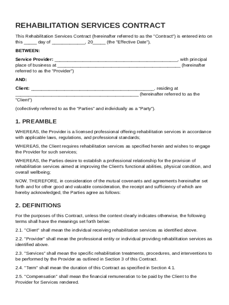 Having a clear and structured contract is vital for rehabilitation services, as it minimizes misunderstandings and disputes. The legal implications of this contract can directly affect both the provider and client, making it essential to seek clarity on all terms.