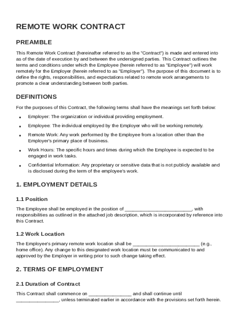 The Preamble serves to establish the context of the contract, clearly outlining the parties involved and the purpose of the agreement. This section lays a foundational understanding, while the Definitions section clarifies critical terms to avoid ambiguities. Important terms may include 'Employer', 'Employee', 'Remote Work', and 'Confidential Information'.
