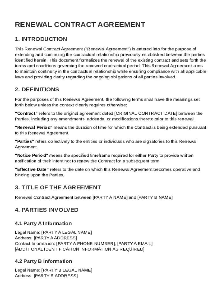 Definitions clarify terms such as 'Contract', which refers to the original contractual agreement, the 'Renewal Period' detailing the significance of the renewed term, and the 'Notice Period' necessary for informing involved parties about any changes.