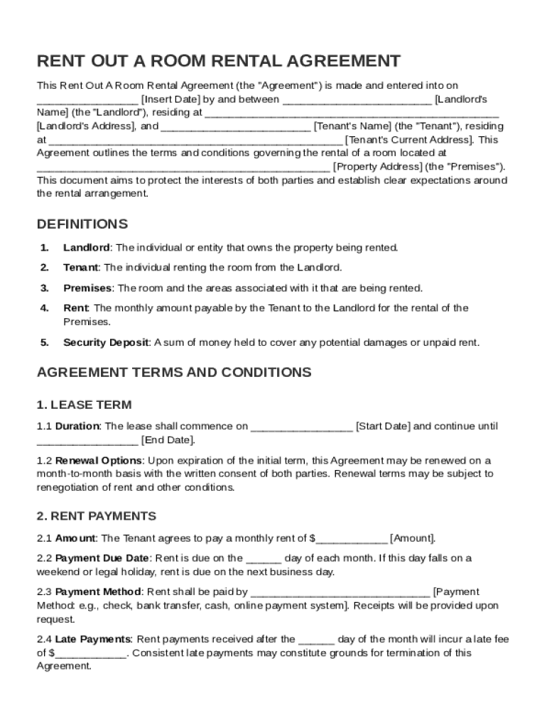 This document outlines the terms and conditions for renting a room, detailing the responsibilities of the Landlord and Tenant, payment terms, and conditions for termination.