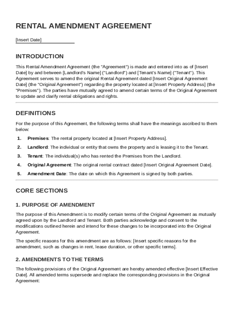 A Rental Amendment Contract Template is a legal document used to modify the terms of an existing rental agreement between a landlord and tenant.