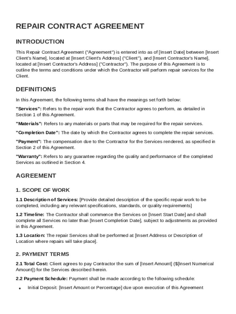 A repair contract template is a standardized document that outlines the terms and conditions between a contractor and a client regarding repair services. This template plays a crucial role in setting expectations, defining responsibilities, and ensuring that all parties are on the same page throughout the repair process.