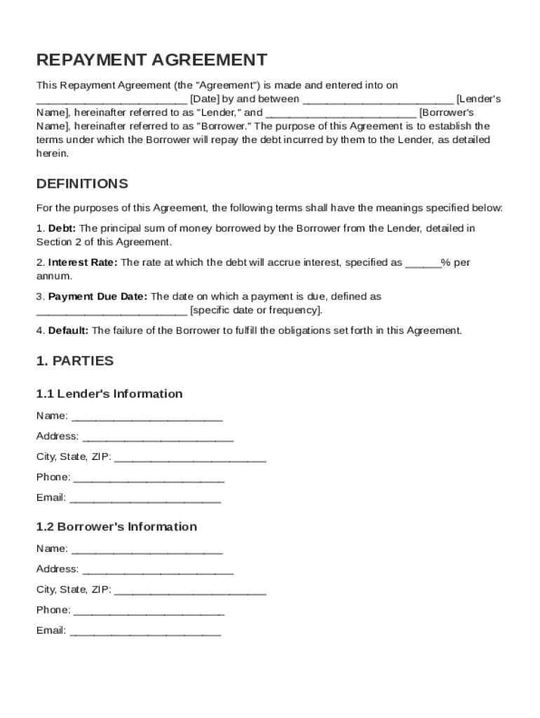 A repayment agreement is a formal contract between a borrower and lender detailing the terms under which the borrowed money will be repaid. These contracts are vital for protecting both parties' interests and can prevent misunderstandings or disputes.