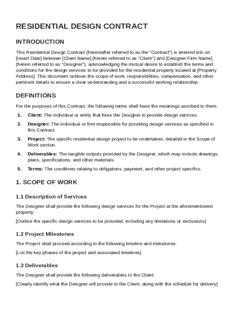 A Residential Design Contract Template is a formal agreement that outlines the terms and conditions between a client and a designer for residential design services.