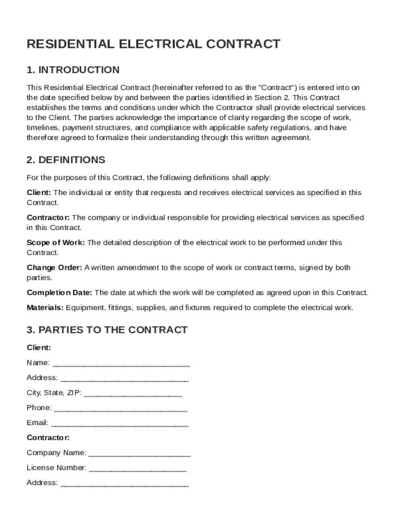 This document establishes the terms and conditions under which the Contractor provides electrical services to the Client, detailing the scope of work, timelines, payment structures, and compliance