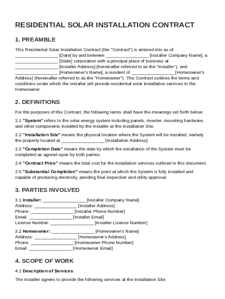 A Residential Solar Installation Contract Template is a formal agreement outlining the terms, conditions, and responsibilities between a homeowner and a solar installation contractor for the installation of solar energy systems.
