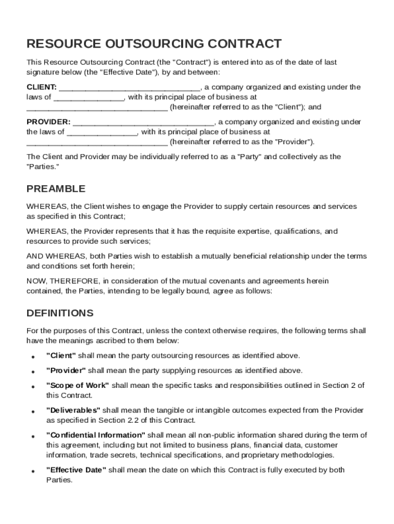 A Resource Outsourcing Contract Template is a standardized document used to outline the terms and conditions for outsourcing resources or services to another party.
