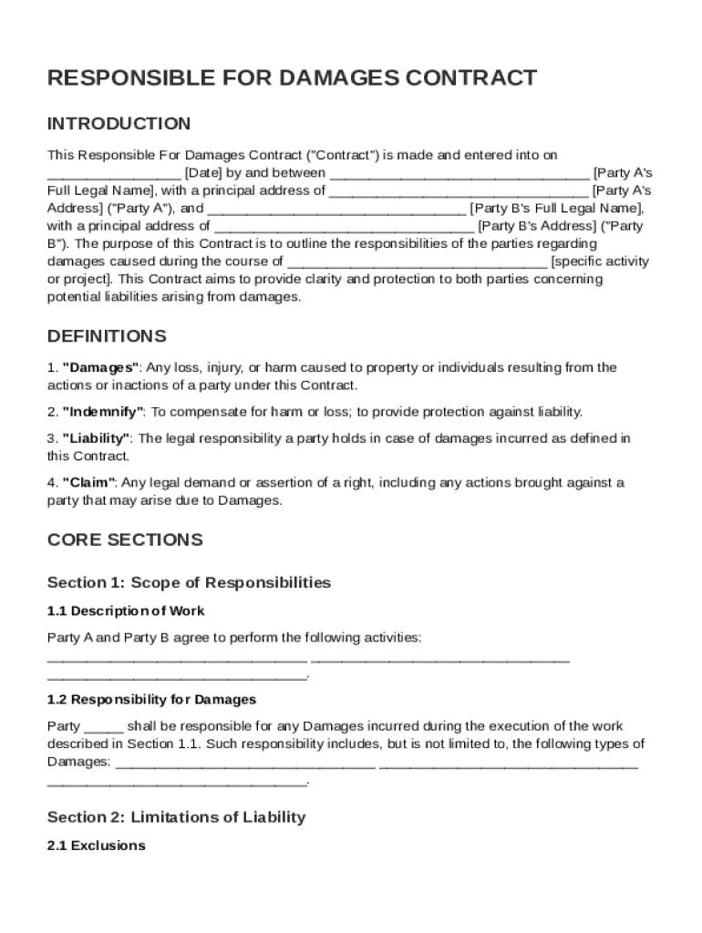 A Responsible For Damages Contract Template is a legal document that outlines the responsibilities and liabilities related to damages incurred during an event or project.
