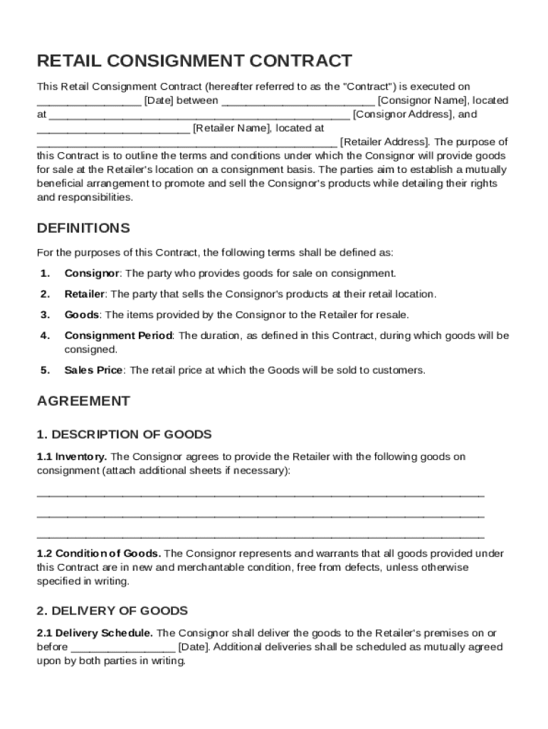 A Retail Consignment Contract Template is a legal document that outlines the terms and conditions under which a consignment agreement is made between a retailer and a supplier or consignor.