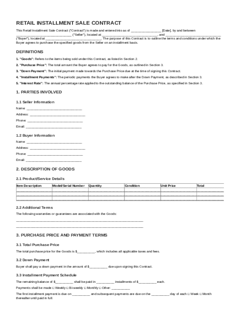 A Retail Installment Sale Contract is a legal agreement between a buyer and a seller for the acquisition of goods, where the buyer agrees to pay the purchase price in installments over time rather than upfront. This contract provides a structured framework for payment, ensuring both parties understand their obligations.