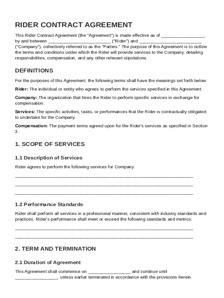 A Rider Contract Agreement should have a clear structure and include essential clauses that outline the rights and obligations of both parties. Typically, these agreements also specify what types of services are covered, which further clarifies mutual expectations.