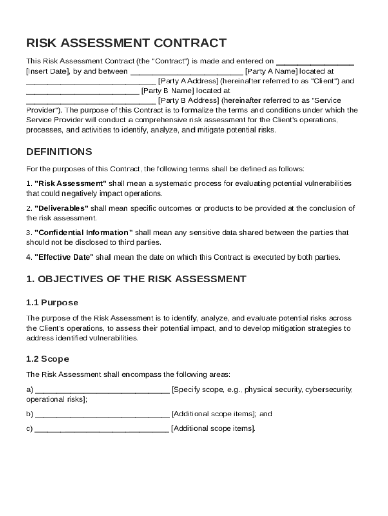 A Risk Assessment Contract Template is a document that outlines the procedures and responsibilities for identifying, evaluating, and mitigating risks in a project or business operation.