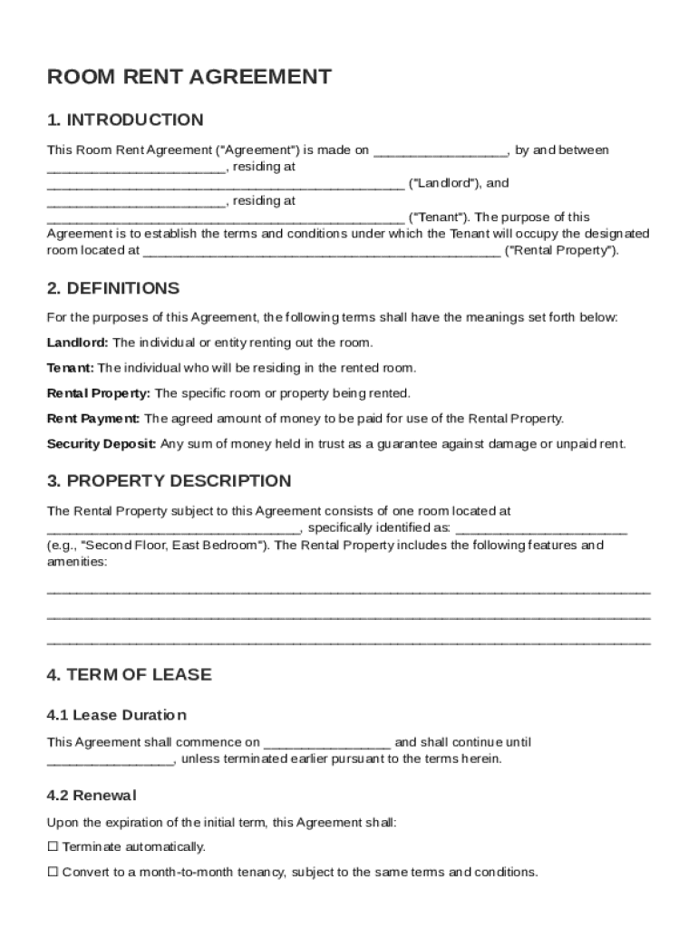 This document is a comprehensive room rent agreement outlining the terms and conditions of the rental arrangement between the landlord and tenant, including property details, lease duration, payment