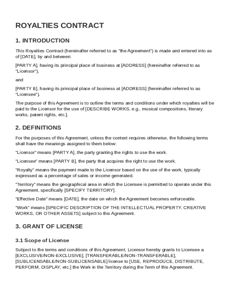 A royalties contract is a legally binding agreement that delineates the rights and obligations of the parties involved, typically a licensor and a licensee. This contract outlines how royalties will be calculated and paid for the use of intellectual property or creative works. Understanding the significance of these contracts is crucial for ensuring fair compensation and adherence to legal standards.