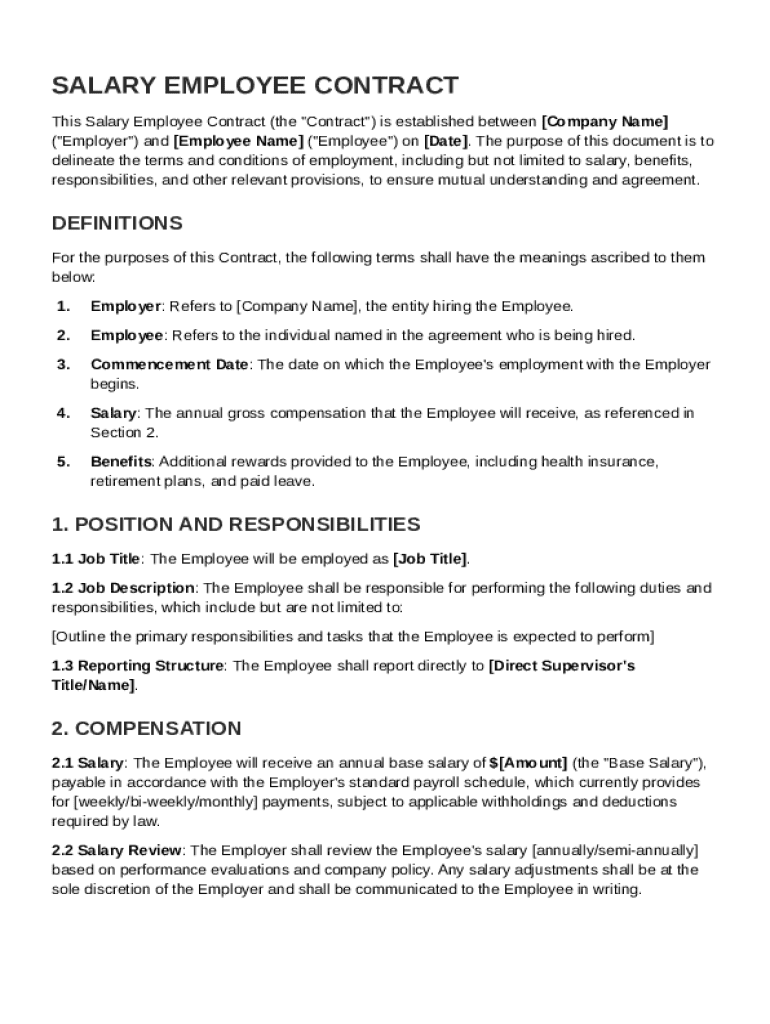 A Salary Employee Contract Template is a formal document outlining the terms of employment for salaried employees, including compensation, duties, and conditions of employment.