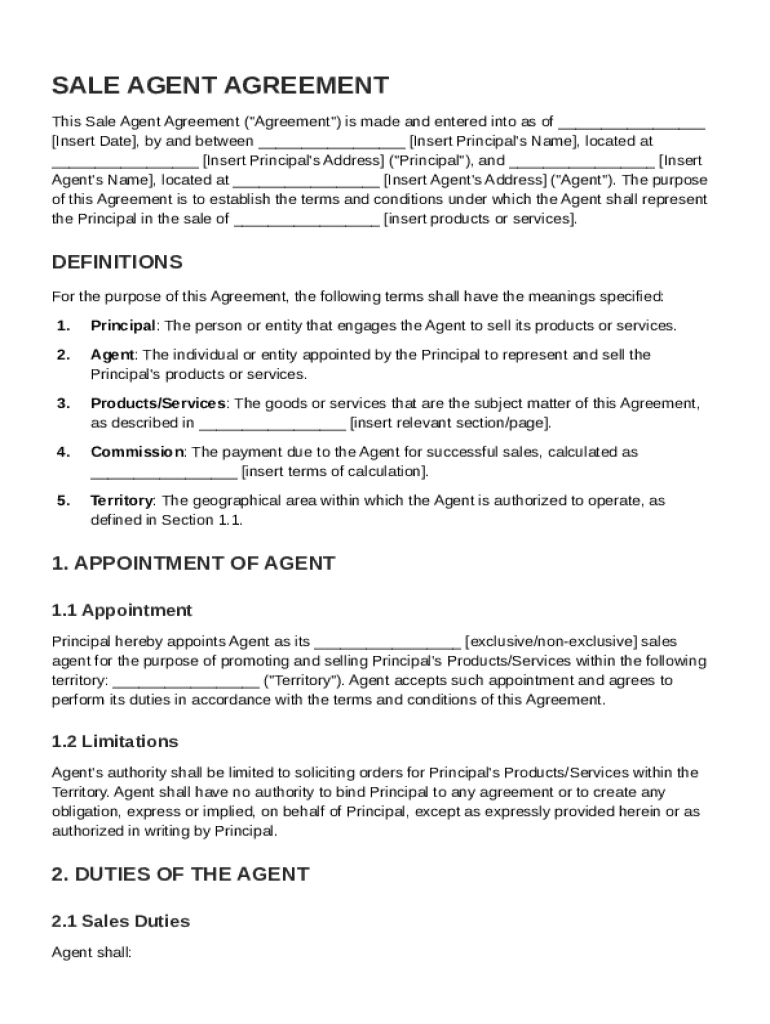 This document outlines the terms and conditions under which an agent represents a principal in the sale of products or services, including duties, compensation, and termination rights.
